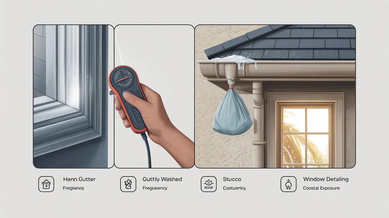 To prevent damage, decrease periods based on environmental exposure. Beachfront or bay-adjacent sites require more frequent window washing to clear away chloride films before etching commences. Gutters surrounding canopy trees need more frequent clearing to maintain design flow and stop soffit seepage. Pressure washing should focus on slip-prone areas where aerosolized salts and fines accumulate, using regulated PSI and suitable detergents to protect substrates.